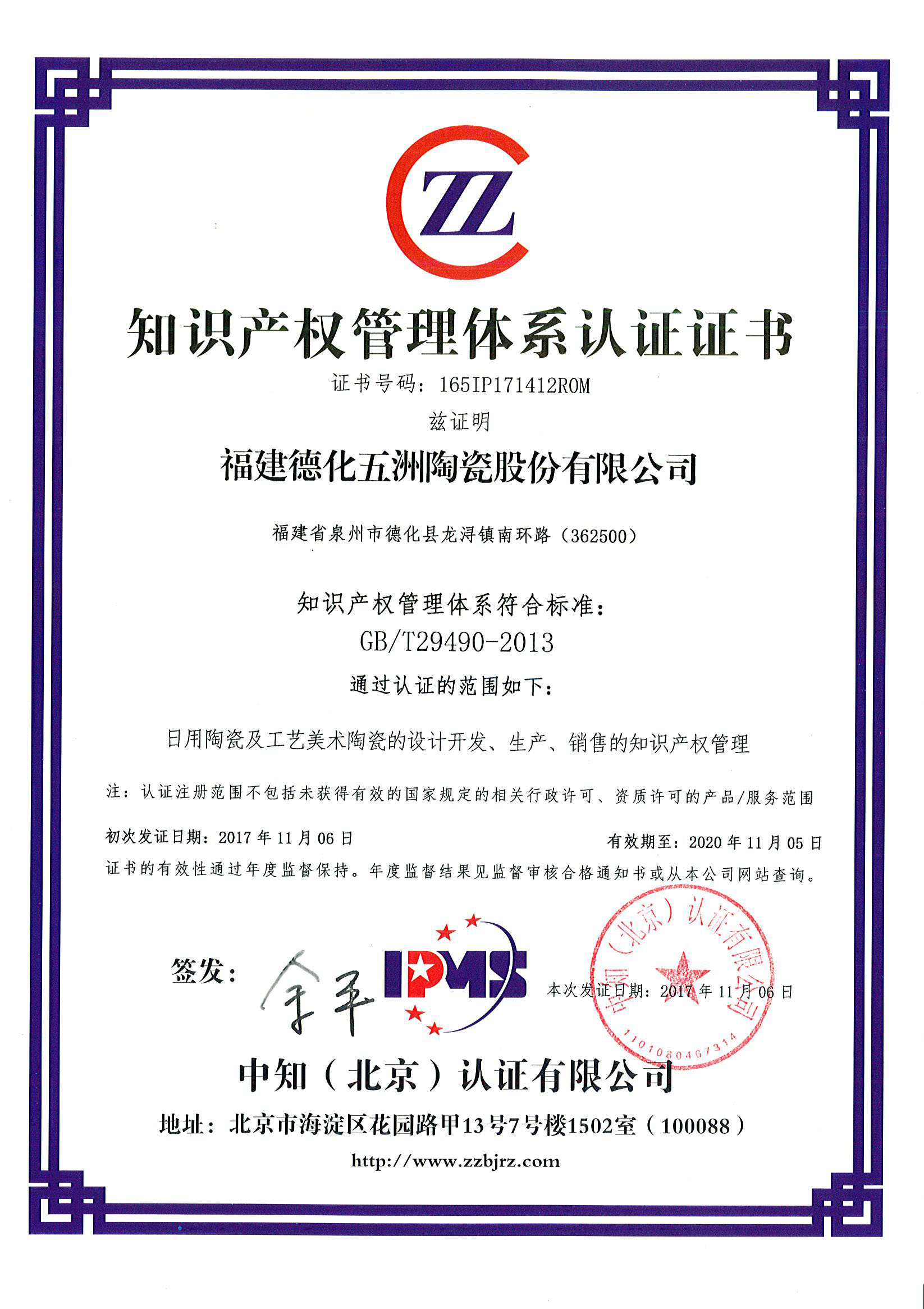 2017年11月 知識產(chǎn)權(quán)管理體系認(rèn)證證書 證書編號:165IP171412ROM