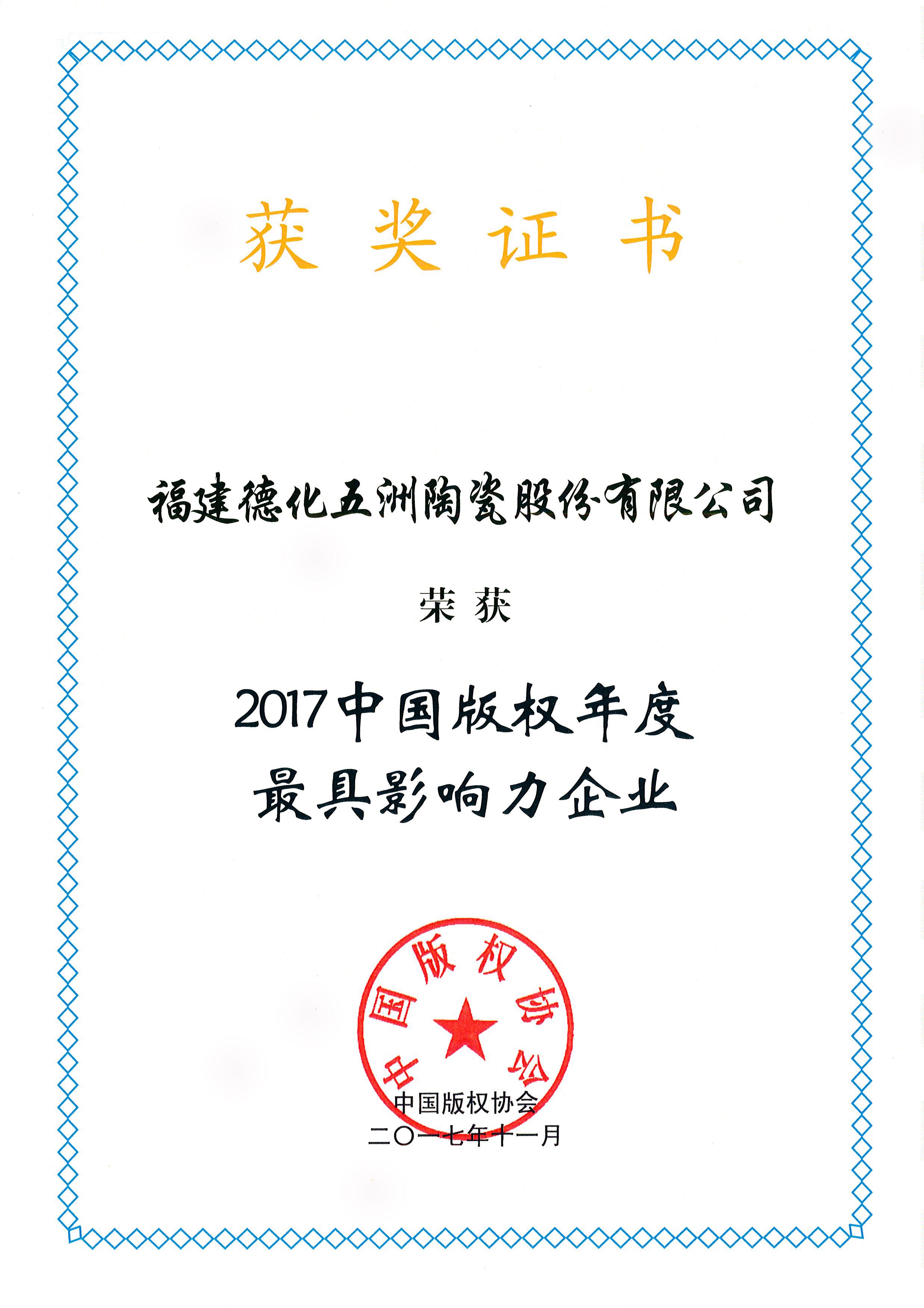 2017年11月 2017中國版權(quán)年度最具影響力企業(yè)