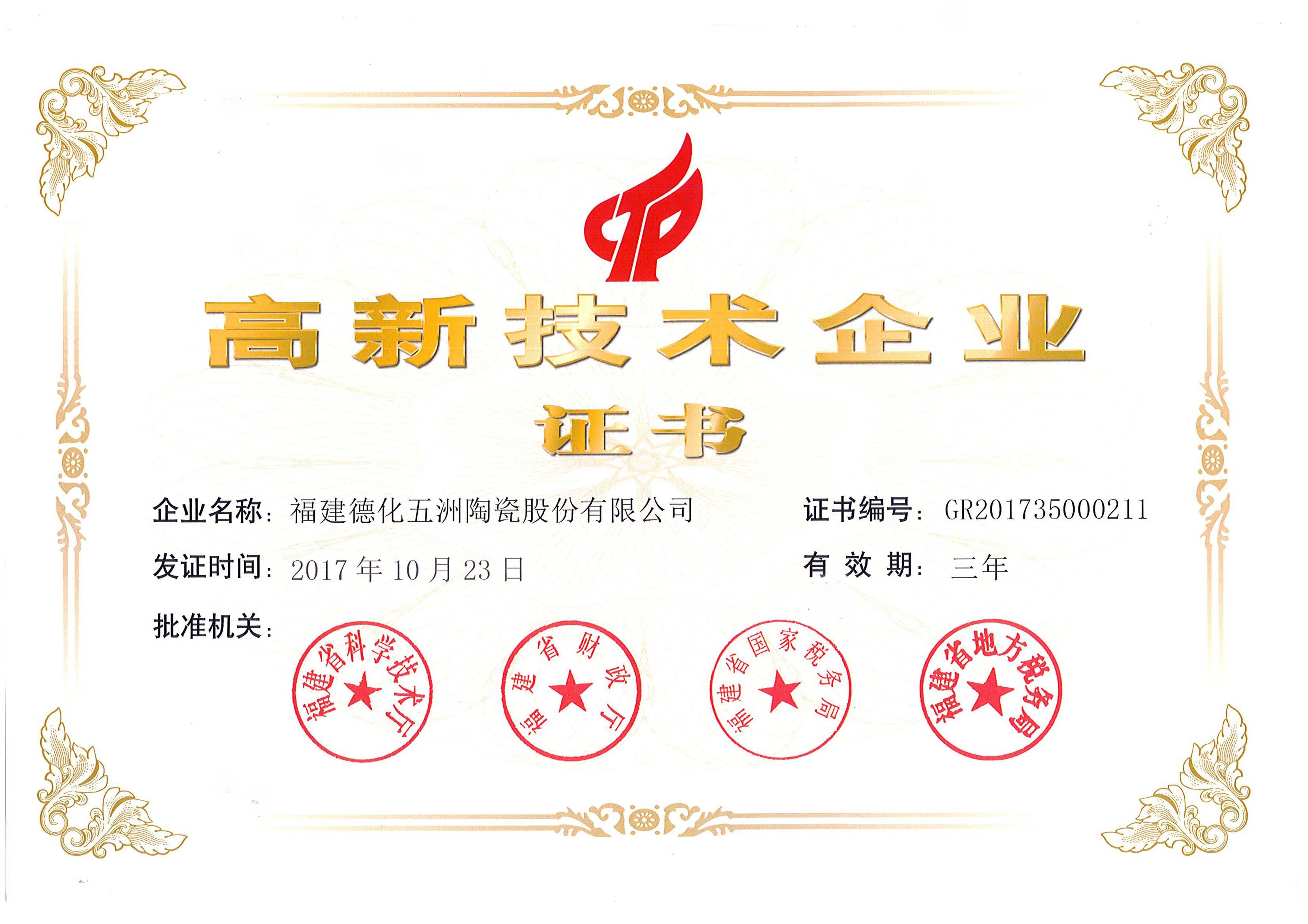 2017年10月23日 高新技術(shù)企業(yè)(有效期三年)證書編號:GR20173500211