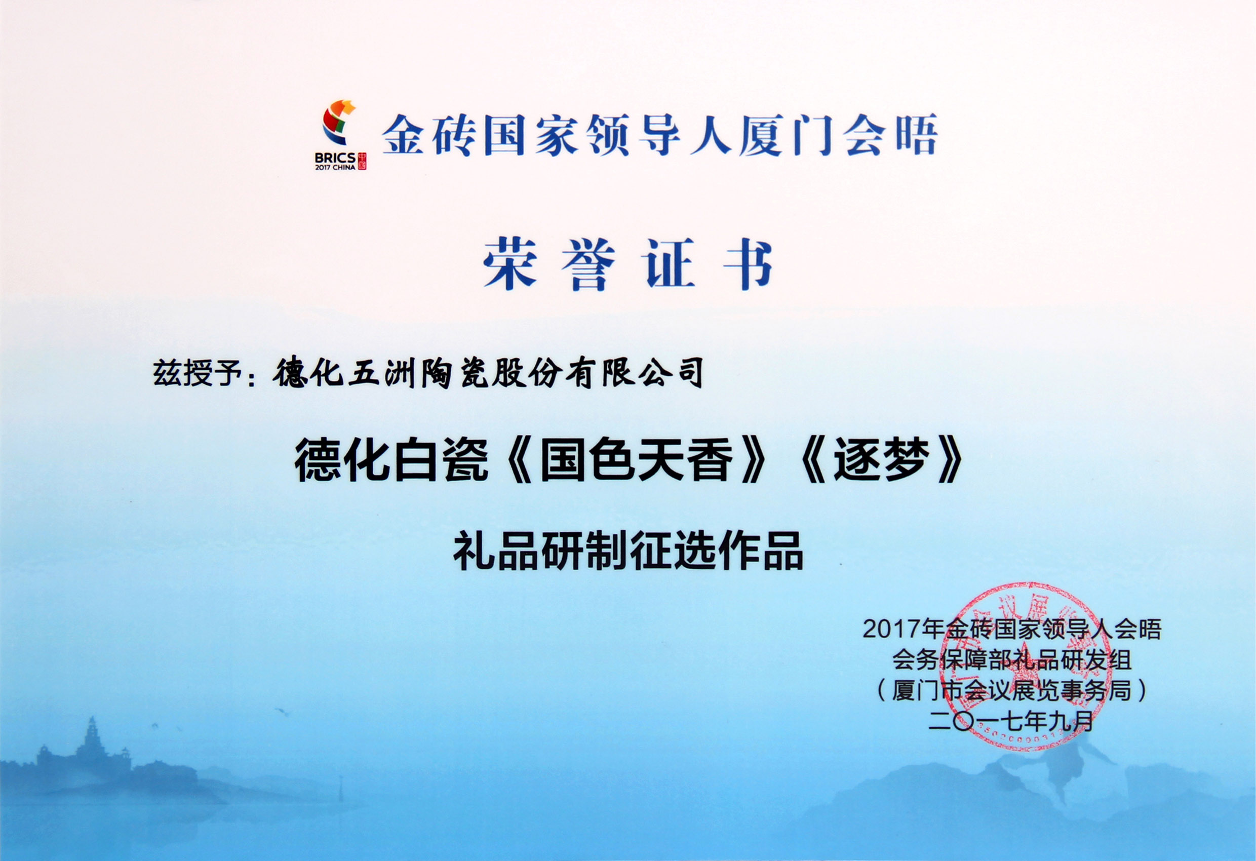 2017年9月 廈門金磚國家領(lǐng)導(dǎo)人廈門會晤 德化白瓷《國色天香》《逐夢》禮品研制征選作品